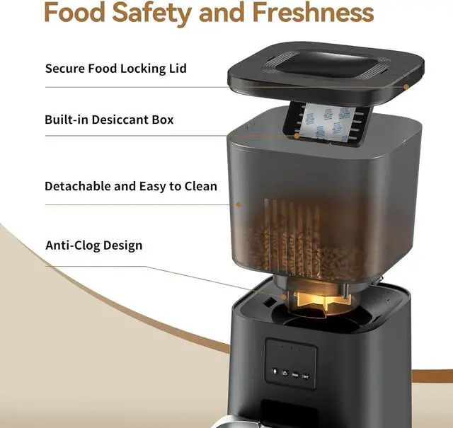Build A Healthy Diet: Set appropriate feeding schedules and portions to help your pet develop healthy eating habits; reduces the risk of health issues caused by overeating; 4 L food container includes a desiccant box to maintain food freshness and keep your pets appetite strong; your pet is fed on schedule, even when youre at work or traveling