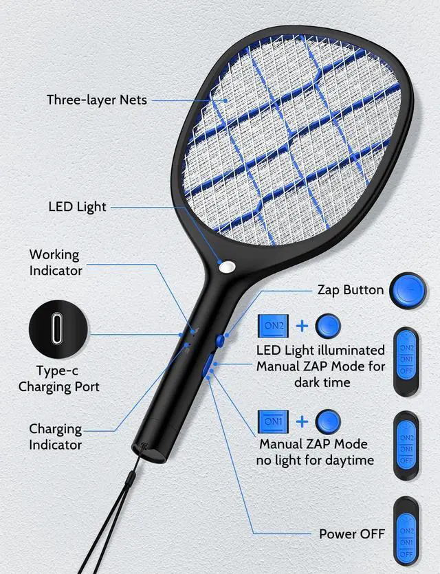LED illuminate light: Turn YISSVIC mosquito swatter on, press the power button to kill bugs. The LED light of electric fly swatter can illuminate in the night. It efficiently catches everything that will drive you crazy... gnats, flies, moths, anything that can be zapped in the darkness.
