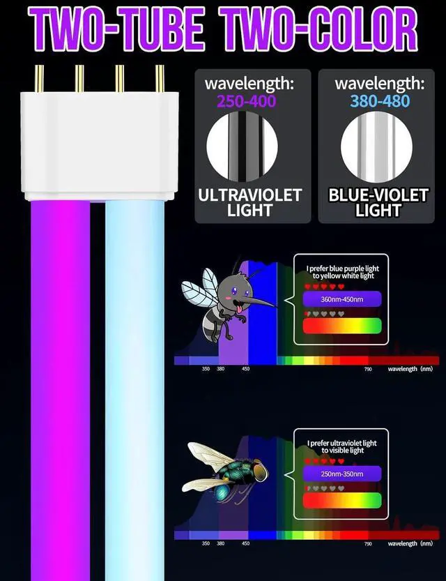 Dual-Wavelength Attraction Features two-color light tubes that emit a broad spectrum of UV light, effectively luring mosquitoes, flies, and other pests for superior trapping performance.