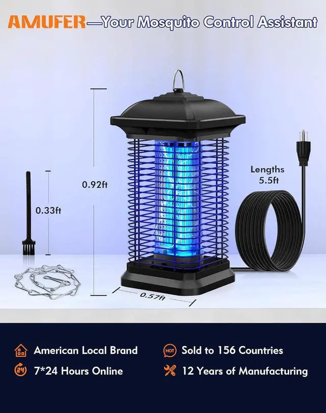 Sturdy & WaterproofThe construction of the AMUFER mosquito zapper is robust and well-designed. It' s built to withstand outdoor conditions, featuring a durable ABS plastic outer casing, which ensures its longevity and protects against Rust, Crack, or Fading. The unit is designed with a three-prong plug and equipped with a 5.5 ft power line, compatible with 90-130V power sources, and IPX4 waterproof design making it a versatile choice for various outdoor settings.