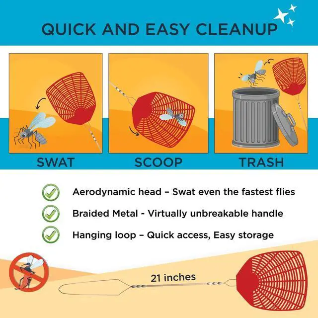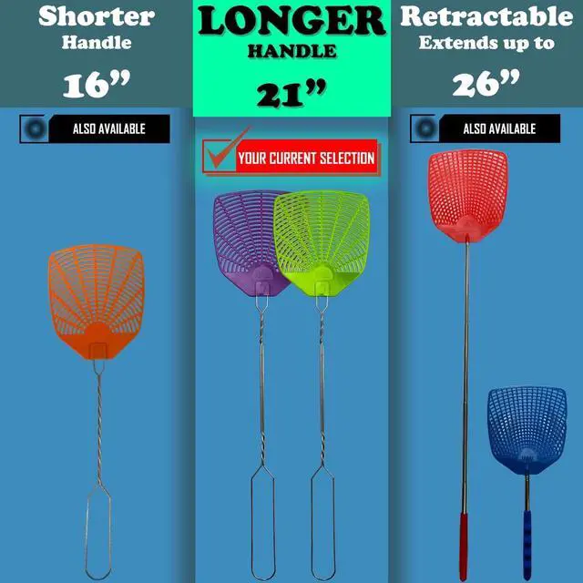 Each Fly Swatter is equipped with an Extra long metal wire handle, these flyswatters measure at 20.5 " inches long (almost 2 ft long), allowing you to reach even the most difficult areas were mosquito flies, spider, bugs, moth, wasp, cricket, hornet and all types of pesky flying insects like to hang out.