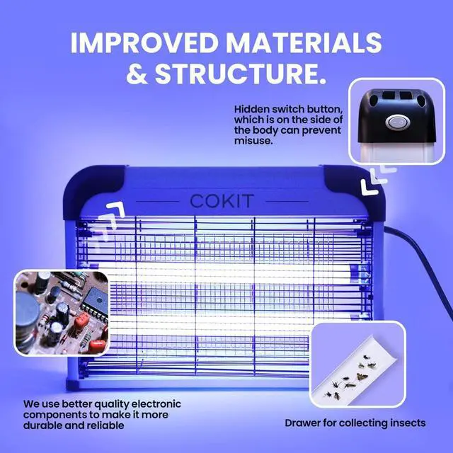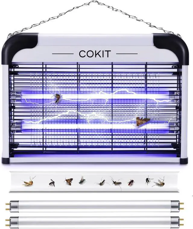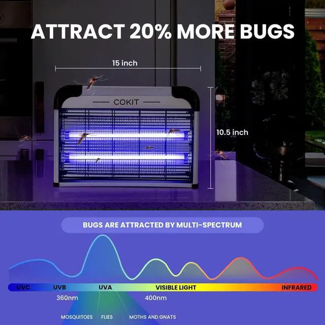 EFFECTIVE ZAPPER: The COKIT Bug Zapper works by attracting mosquitoes, flies, bugs, moths, fruit flies, wasps, bees, insects, and most flying crawling pests with 2 of 10W 365nm UV bulbs. They get trapped and electrocuted in the electrically charged high-voltage metal grill. This mosquito zapper kills flying insects up to 600 square feet! Please make sure it is for use at 110V-120V household voltage.
