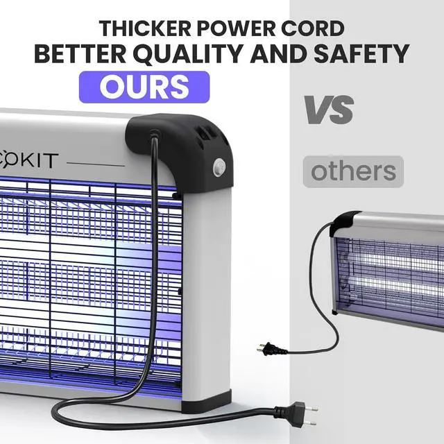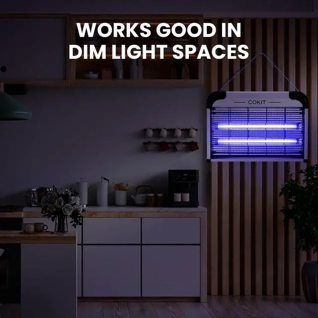 HANGING & STAND: The COKIT indoor bug zapper comes with a chain and 2 metal grommets, easy to install. So you can hang it anywhere on a hook or place it on any work surface, table, or even the floor of a problem area. Usually, hang it on a high place. Can be used safely and securely in living rooms, factories, food stores, butcher warehouses, hospitals, commercial spaces, restaurants, kitchens, warehouses, and retail stores. Definitely not suitable for outdoor use. This zapper is not waterproof!