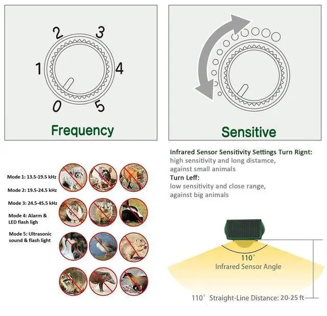 Note: Animals may respond differently to each mode of the repellent, even within the same species. If one mode does not seem effective, we recommend trying others to determine the most suitable setting. Please allow up to two weeks of consistent use, as finding the optimal mode may take some patience. Experimenting with different modes is the key to achieving the best results.