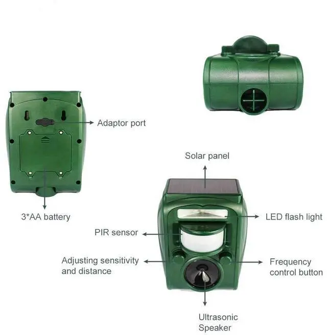Solar Powered and Waterproof: With a solar panel on the top of the device, it can be charged by solar energy, that benefits in energy saving and environmental protection. It also can be charged with included USB cord. This outdoor repellent uses high-grade material with the weatherproof and UV-protected construction, which can protect itself against water splashed from all directions and withstand normal rain, snow, or the harsh sun. it is perfect for garden, yard, farm.