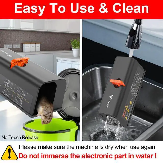 • No Touch & No SeeBlue Light blinking,indicates successful rat kill.To discard the exterminator rodent, simply pick up the device and pull up the orange baffle, slide the dead mouse into the trash bin.Reusable trap for easy clean with hot water and soap and you're for your next catch .For safety, always remove the plug before cleaning and DO NOT wash the RIGHT SIDE--THE CIRCUIT BOARD SECTION to avoid damage