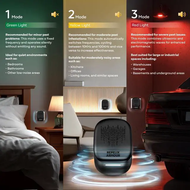SOUND SENSITIVITY NOTE: In modes 2 and 3, some people or animals can hear ultrasonic sound, others may not. This is normal and does not affect effectiveness. If you mind, switch to Mode 1, the quietest option.