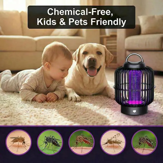 A: This bug zapper uses 100% physical electrocution technology with specific UV light to lure insects, with no fumes, odors, or harmful chemicals released during use, making it a much safer choice for households with children and pets compared to chemical pest control products. For added safety, we recommend placing the unit on a high tabletop or hanging hook out of direct reach of young kids and pets to avoid accidental contact with the high-voltage grid.