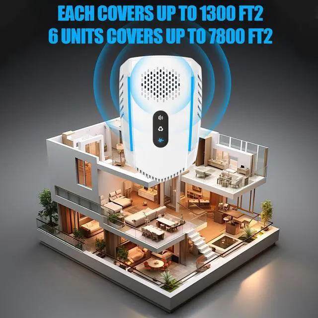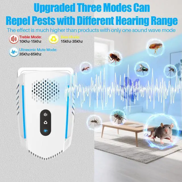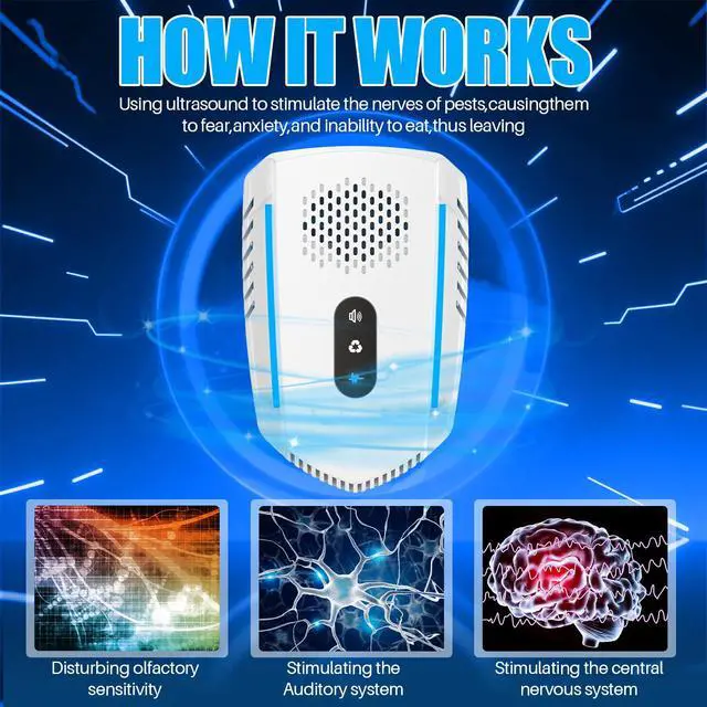 Latest Ultrasonic TechnologyIntelligent frequency conversion with three different sound wave frequencies. Combines 10kHz-65kHz frequency conversion technology with 3D surround dual speakers to disrupt the nervous.Influences on the auditory and nervous system of such as mice, rats, spiders, ants, bugs, cockroaches, mosquitoes, fruit flies, flea, crickets, insects and rodents through unique ultrasonic waves.They will escape spontaneously from the area that the ultrasonic covered.