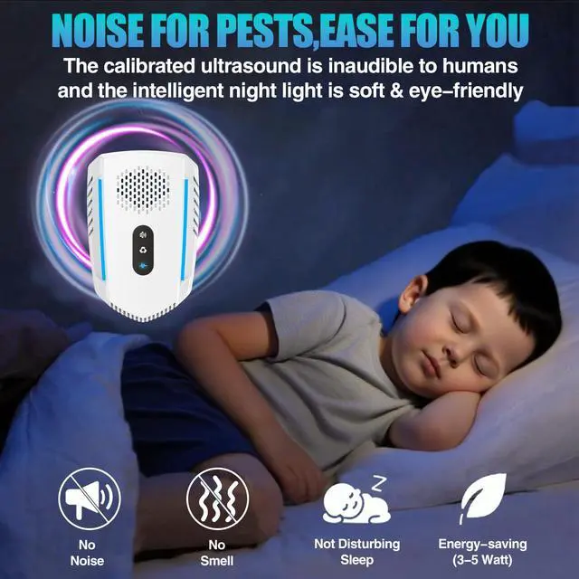 Easy InstallationJust plug the electronic control ultrasonic repellent in power sockets; it will start to repel the when the blue light on.No noise, no smell, and can emit ultrasonic waves that cannot be heard by humans or animals. Ultrasonic control can effectively drive out of the house without killing them, The electronic repeller will not affect your home life at all.