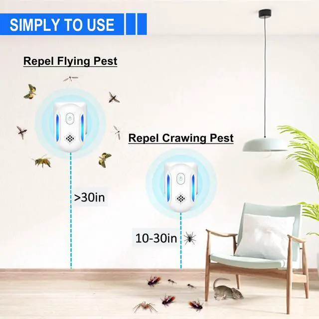 Simply to Use: Just plug the ultrasonic bug repeller in US power socket and press the power button once, which mean it is start working. Install different heights depending on the type of pest, recommend install the device between 10-30 inches from the floor for crawling pests, 30-50 inches from the floor for flying pests.