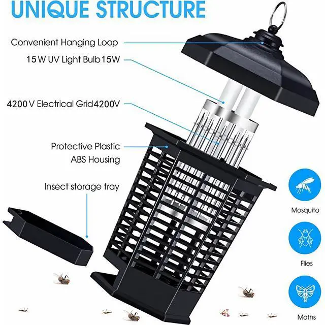 Bug Zapper Outdoor & Indoor, 4200V Electric Mosquito Killer with 15W Attracting Lamp, Waterproof Insect Trap for Yard, Home, Balcony & Garden