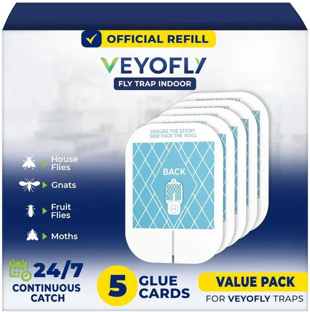 VEYOFLY Gnat Trap refills are best for fruit flies and gnats, with strong customer results. They also catch small flying insects, moths, and some mosquitoes. Less effective for large house flies, as the blue light mainly attracts smaller insects.