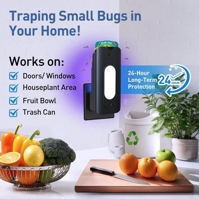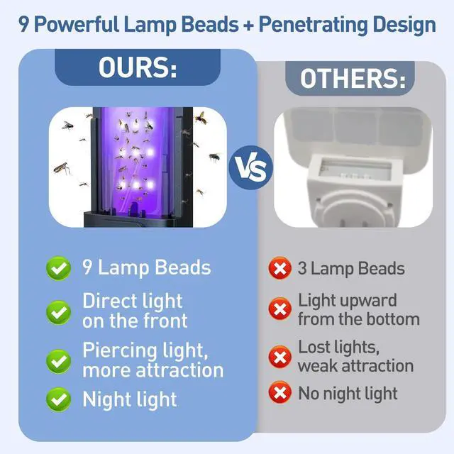 Upgraded Fly Trap IndoorTraditional fly traps have flaws: lamp-post type designs lose 50% capture rate due to gaps, while bottom-upward light types waste 50% of the divergent light. Our solution adds 9 LED lamp beads on the back-panel that diffuse puncture light onto a transparent glue board, so that the flying insects 90% can be trapped on the transparent glue board by the puncture light.