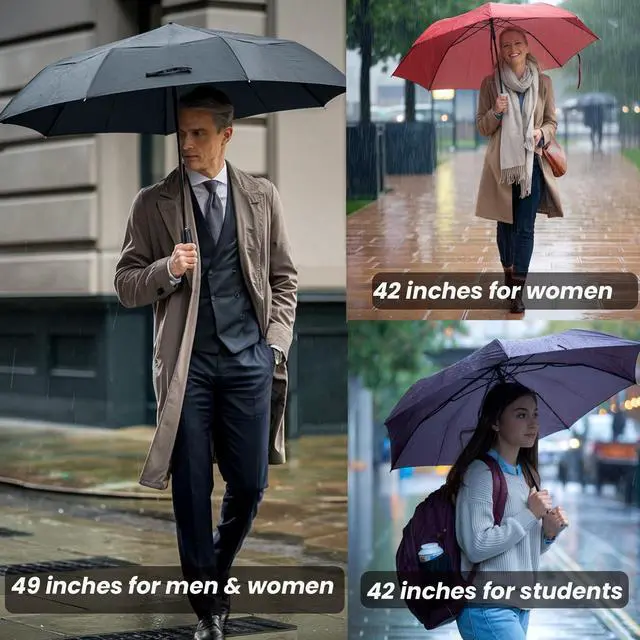 Folding umbrellas are smaller than straight-handled umbrellas and can fit in pockets, bags, car storage drawers and other tight Spaces
