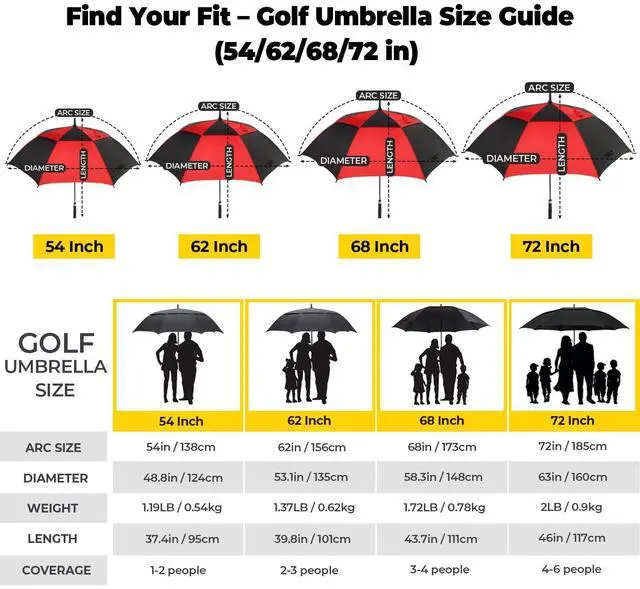 The canopy diameters of the umbrella when open are different. 54"(diameter 45in), 62"(diameter 52in), 68"(diameter 59in), and 72"(diameter 66in).
