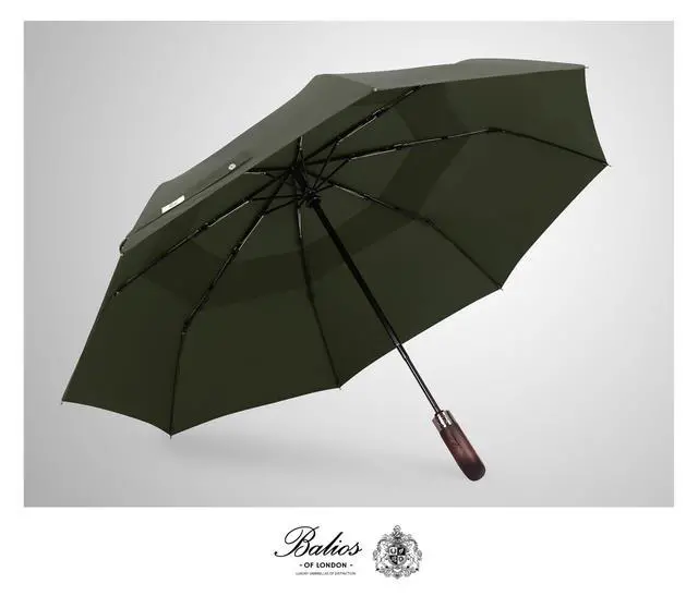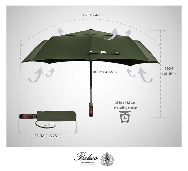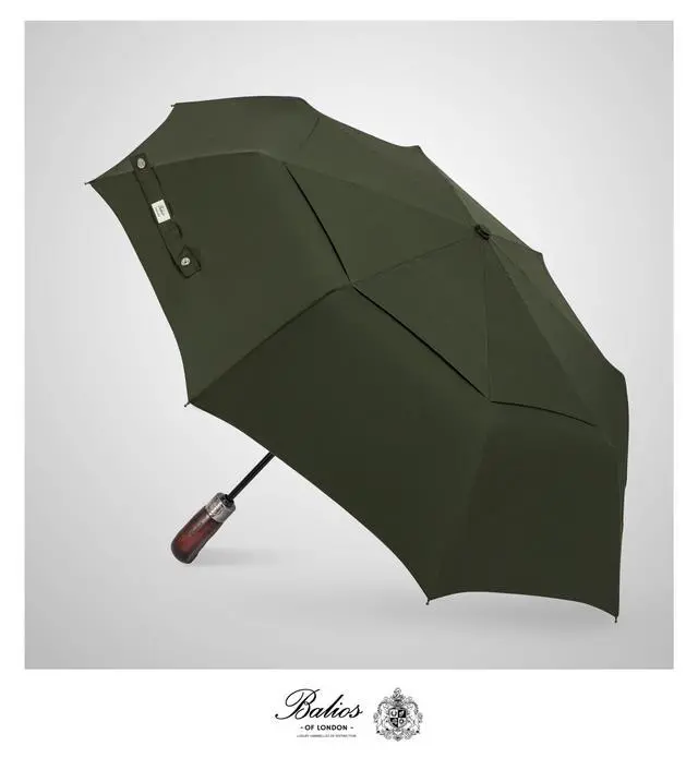 Prestige Travel Umbrella, Real Wood Handle, Auto Open & Close, Vented Windproof Double Canopy, Designed in UK (Olive Green with Real Wood Handle)