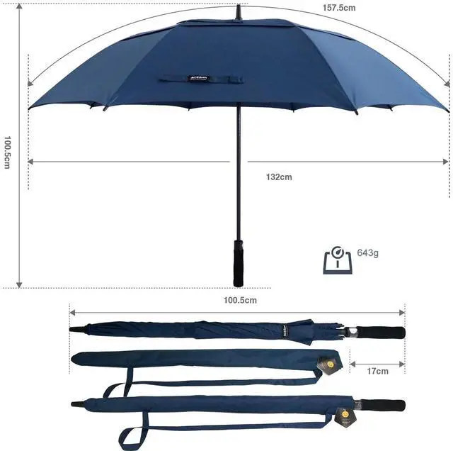 The Golf's exclusive "Duplex Frame" dual-canopy design navigates wind through its vented construction.It allows wind to pass through the top without fear of inversion during sudden gusts. This umbrella is built to last through heavy rain and wind, finished with an attractive metal end cap that provides a non-slip grip option during wet conditions. The fabric used to construct the umbrella is of the highest quality, and it is 100% waterproof, allowing you to continue your round when the rain comes down.