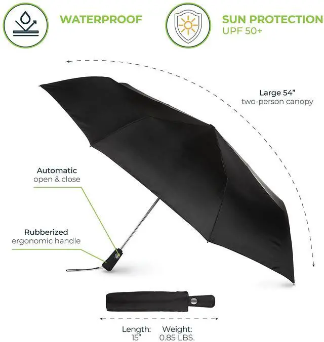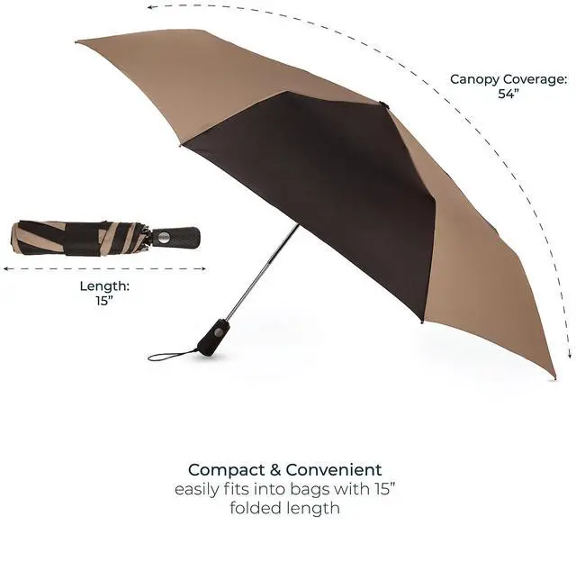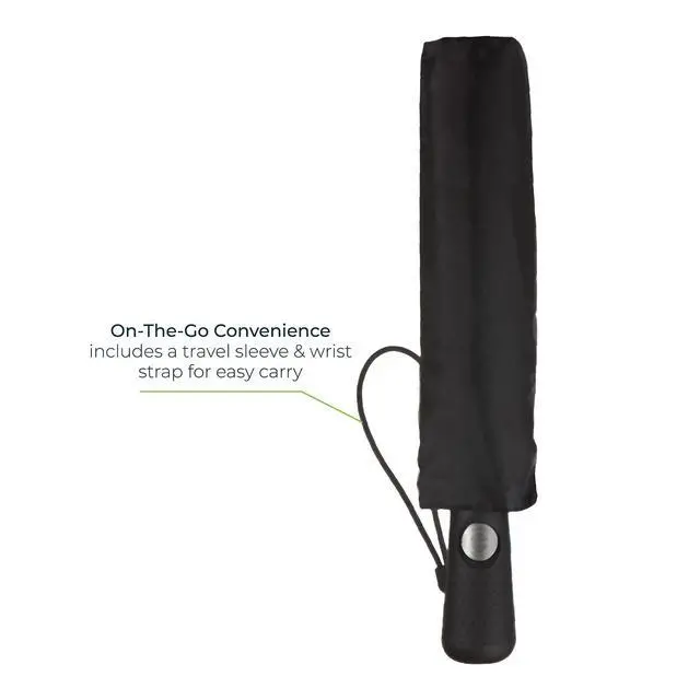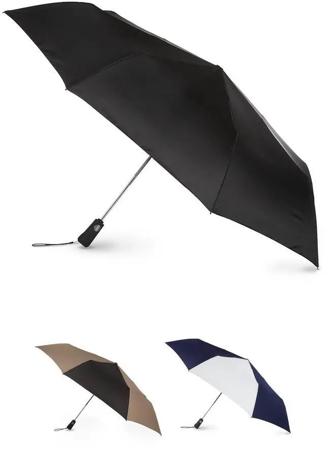 | Description | The beautiful, smooth wooden crook handle on this umbrella provides a classic look with easy handling and a secure grip. Automatically opens with the touch of a button. | This golf size umbrella combines extra large coverage with easy carry convenience! Easy auto open and close and durable handle with wooden tip. | This golf umbrella's extra large 64-inch canopy is vented for reduced wind resistance and large enough to cover two people. | totes InBrella is a durable and versatile double layer canopy umbrella that closes inside out with the wet side away, keeping you completely dry | This compact umbrella is designed for portability with a convenient easy-carry wrist strap and wide tie strap for storage. Auto opens with the touch of a button. |