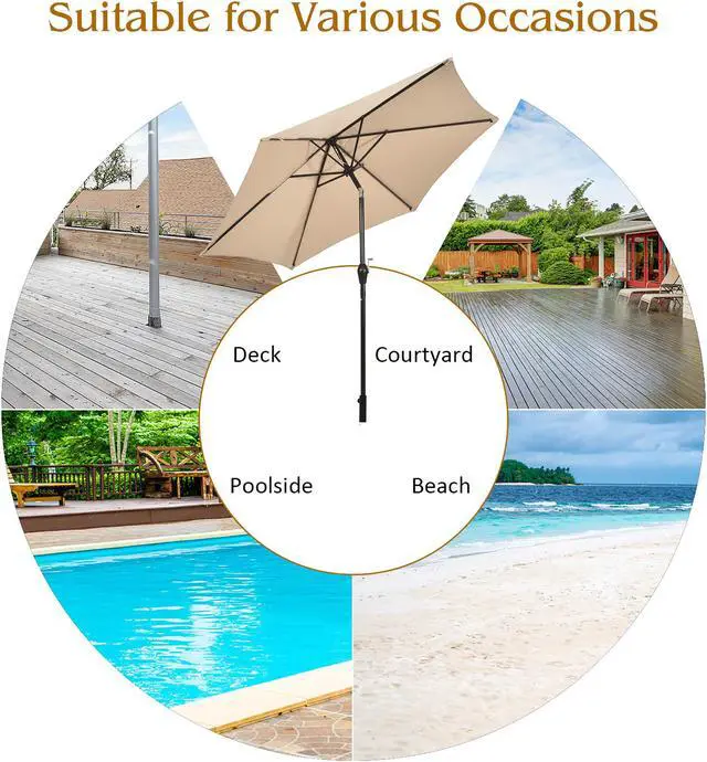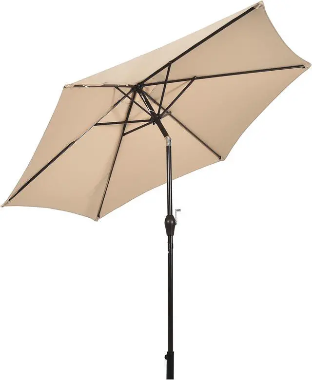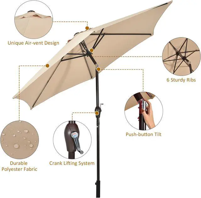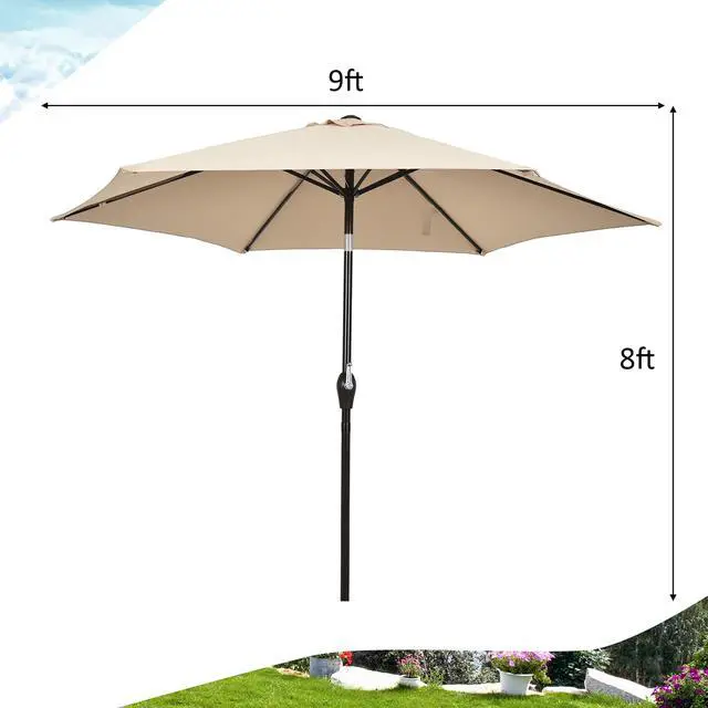Are you still bothered by the scorching sunlight when you enjoy the outdoor lounge time? Our 9ft patio umbrella is effective at blocking the sunlight thanks to premium polyester fabric and innovative tilt mechanism. It also shows great performance in fade resistance to provide years of elegance. Furthermore, our umbrella is supported by a solid iron pole and 6 sturdy ribs, which is not easy to shake and deform. The special air vent design can facilitate air flow and make you feel cool and comfortable in hot summer. In addition, with a convenient crank, the opening and closing becomes very easy. And you don't need to worry about the assembly since it is fairly easy with no tools required.