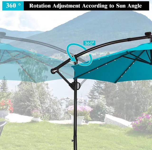 The luxurious outdoor patio umbrella is a good companion outdoors. Our patio offset umbrella is up to 10ft in diameter and provide a large shaded area to protect you and your family from the sun. Meanwhile, the vent at the top of the umbrella allows cool air to flow through, thus creating a comfortable environment for you. And the gliding handle and simple tilting system allow you to adjust the umbrella at any angle. You can also freely rotate the umbrella to the position you like. Moreover, the patio umbrella is made of high quality powder coated aluminum rod and polyester fiber, which is sturdy enough to be used for a long time. The most important thing is that the offset umbrella has 32 LED lights powered by solar panels, which can provide perfect illumination at night. Please don't miss it.