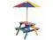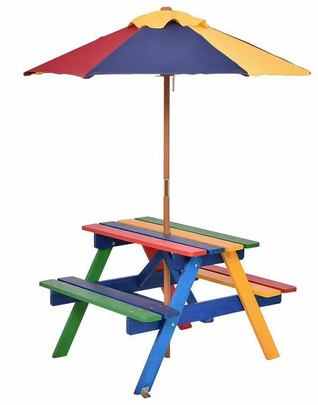 This kids picnic table can be used as a play table or picnic table. Four children can sit comfortably for social play and interaction. With an umbrella, this picnic table is perfect for your kids to enjoy their meals or snacks outdoors. Give your child a space of their own in your backyard to eat, play and relax with the 4-Piece Wood Picnic Set. Do not hesitate to buy it!