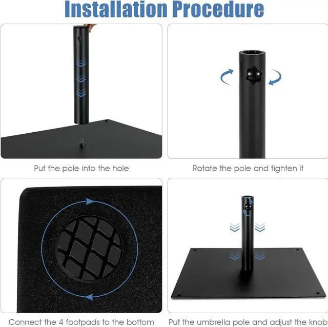 Simple Design for Easy Installation: The simple design of the umbrella base make it easy to assemble without additional tools. You can simply finish it by attaching the steel tube to the base using the gasket and bolt provided, inserting the patio umbrella and tightening the manual knob.