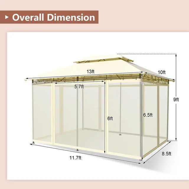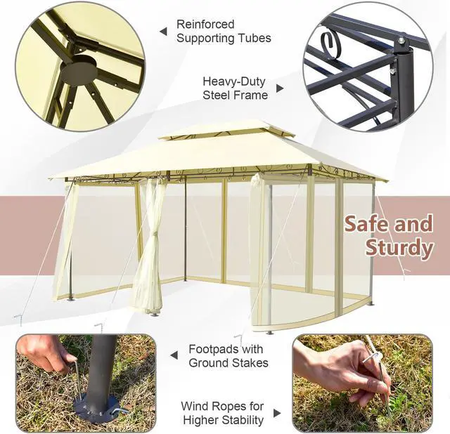 Safe and Sturdy Structure: The whole gazebo is supported by heavy-duty steel frame, which is super sturdy and anti-rust. And the reinforced supporting tubes on the top highly increase the sturdiness. Moreover, the wind ropes and the footpads with ground stakes are also designed for higher stability.