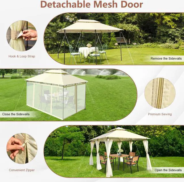 Detachable Mesh Door: The gazebo also comes with 6 pieces of mesh sidewalls which are hanged by loops. Therefore, you can enjoy outdoor leisure time in a more comfortable environment. Also, the convenient zipper makes it easy to open, close or remove the side walls, and thus satisfying your different needs.