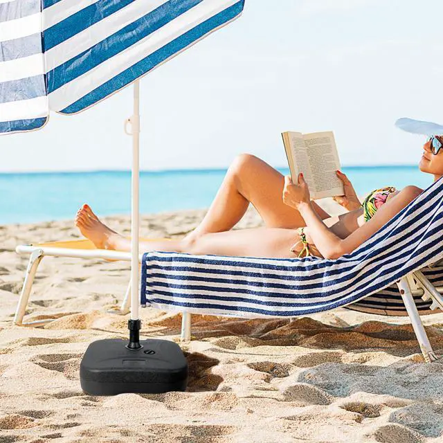 Easy and Quick Installation: This weighted market umbrella base is easy to set up and no tools are required. All you need to do is insert the supporting pole, fill it with water or sand and tighten the ring cap, then insert and tighten the umbrella pole.