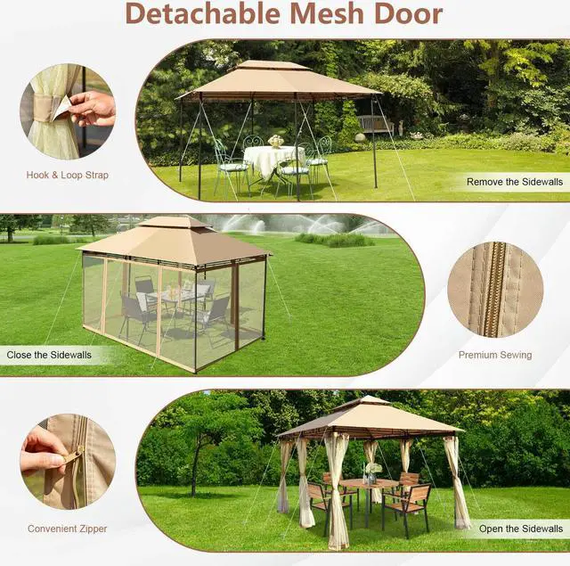 Detachable Mesh Door: The gazebo also comes with 6 pieces of mesh sidewalls which are hanged by loops. Therefore, you can enjoy outdoor leisure time in a more comfortable environment. Also, the convenient zipper makes it easy to open, close or remove the side walls, and thus satisfying your different needs.