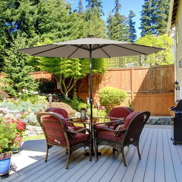 All-Day Shade Enjoyment: The 10ft diameter canopy creates a wider shade area than ordinary umbrellas on the market, which can shade your 54"- 66" round, square or rectangle table and 4 to 6 chairs. Moreover, with a convenient push-button tilt mechanism, the canopy angle can be easily adjusted to block the direct sunlight in all directions when the sun's position changes.