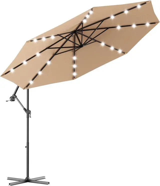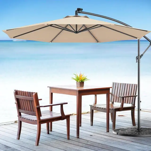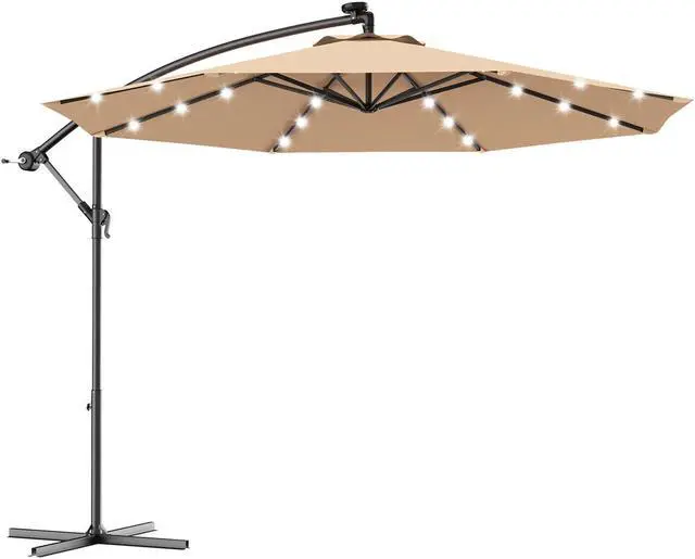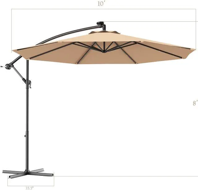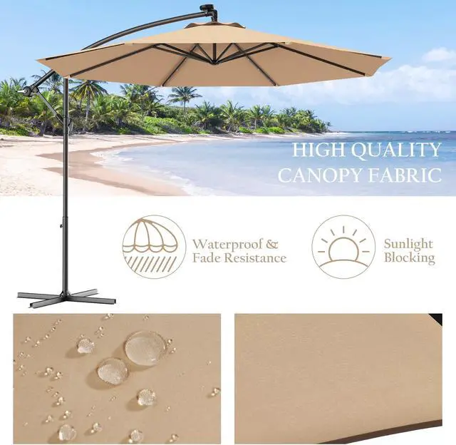 Umbrella with Solar LED Light: Equipped with 3 LED lights on each rib, this offset umbrella has a total 24 built-in LED lights powered by solar panel. On sunny day, solar panel on the top of patio umbrella save the solar energy so after the sunset you can turn on the LED lights and enjoy the beautiful summer night.