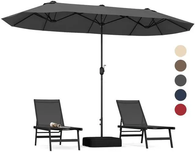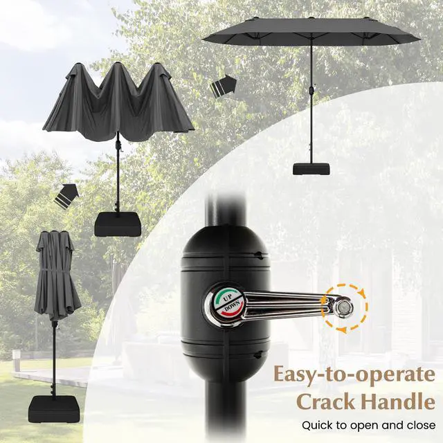 Description: Double-sided design enlarges shade area to accommodate more peoplePA coated yarn-dyed fabric is non-fading sun-proof and drizzle-resistantVented top facilitates air circulation and improves stabilitySprayed metal umbrella pole ensures higher stabilityDouble stitched rib pockets keep the 12 strong metal ribs in placeEquipped with safety lock to prevent accidental foldingQuick to open and close the umbrella with easy-to-operate crank handleIncluded fillable weighted stand adds stabilityFixing strap for easy storage and foldingApplicable to pool deck patio garden yard