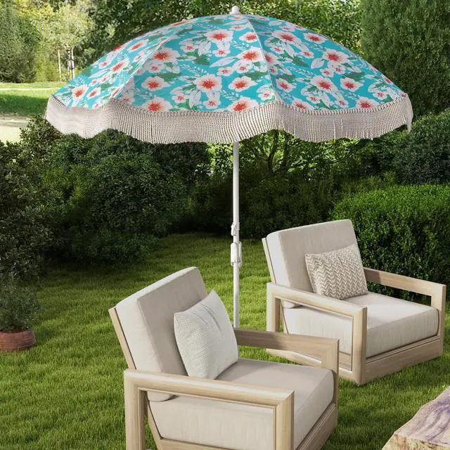 Description: Premium polyester fabric with silver coating provide UPF 50+ protectionAdjustable tilt allows you to enjoy customizable shade coverage all day longLabor-saving spiral sand anchor help secure the boho umbrellaOpen the handrail and turn it clockwise to insert the sand anchor8 sturdy ribs and powder-coated metal pole ensure a reliable structureElegant fringe makes it a perfect addition for poolside deck garden yardEasy to set up and open the umbrella with detachable pole and convenient triggerYou can insert the safety latch to prevent the umbrella suddenly closeEasy to transport to anywhere with included carrying bagFixing straps will secure the folding umbrella Superior rib pocket hold the umbrella rib in placeCharming floral pattern/stylish striped design and decorative top add the style of your outdoor space