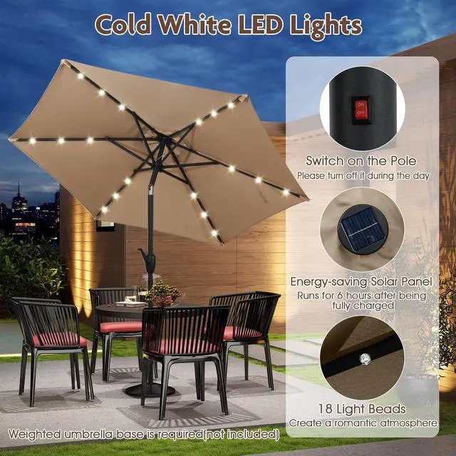 Description: 18 light beads create a romantic atmosphereEnergy-saving solar panel runs for 6 hours after being fully chargedSwitch on the pole is easy to access (please turn off it during the day) Sun-proof polyester fabric is wear-resistant and anti-fadingEffortlessly enjoy the optimal shade throughout the day with push button tiltCrank handle allows you to open and close the umbrella within secondsFeaturing an air vent to offer extra cool and improve stabilityThick heavy-duty umbrella ribs promise a sturdy structureDetachable 2-section poles and fixing strap allow for easy storageReinforced rib pockets keep the umbrella ribs in placeNote: Weighted umbrella base is required (not included) Assembly needed
