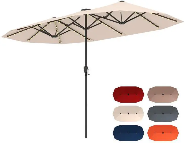 Manual Description: The 13 ft/392 cm patio umbrella features a double-sided design for larger shade coverageCrafted of 180 GSM polyester fabric fade-resistant water-repellent and reliableEquipped with 108 LED lights emit a cozy yellow lighting enhance night ambianceThe LED lights are controlled by a handy switch on the pole easy to operateThe lights are powered by a solar panel provide 6-8 H illumination after a full chargeThe top solar panel efficiently converts sunlight into electricity save energyThe crank handle makes it easy and effortless to open or close the umbrellaThe umbrella can be effortlessly detached into 2 sections for space-saving storageEquipped with protective rib pockets prevent the canopy from tearingConstructed from powder-coated metal tubes provide strong and reliable supportSupported by 12 robust metal ribs ensure excellent stability and wind resistanceRequire assembly