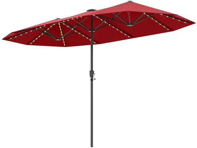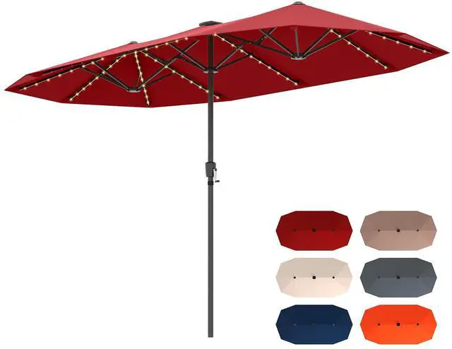 Manual Description: The 13 ft/392 cm patio umbrella features a double-sided design for larger shade coverageCrafted of 180 GSM polyester fabric fade-resistant water-repellent and reliableEquipped with 108 LED lights emit a cozy yellow lighting enhance night ambianceThe LED lights are controlled by a handy switch on the pole easy to operateThe lights are powered by a solar panel provide 6-8 H illumination after a full chargeThe top solar panel efficiently converts sunlight into electricity save energyThe crank handle makes it easy and effortless to open or close the umbrellaThe umbrella can be effortlessly detached into 2 sections for space-saving storageEquipped with protective rib pockets prevent the canopy from tearingConstructed from powder-coated metal tubes provide strong and reliable supportSupported by 12 robust metal ribs ensure excellent stability and wind resistanceRequire assembly