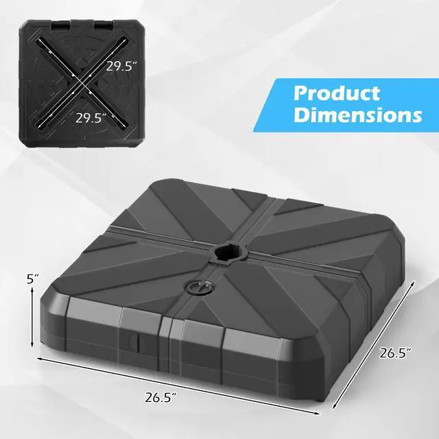 Specification: Color Black Material HDPE Metal Product Dimensions 26.5" x 26.5" x 5" Cross Bracket Dimension 22" x 3.5" Fill Capacity of the Water 100 lbs Fill Capacity of the Sand 132 lbs Fill Capacity of the Water & Sand 176 lbs Suitable Umbrella Pole Diameter 1.9" Suitable Umbrella Size 300 cm Net Weight 11.5 lbs Box QTY 1 (May vary by batch) Package Includes 1 x Umbrella Base 1 x User"s