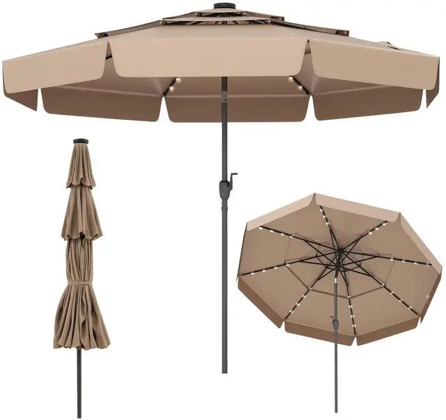 Description: Comes with a 3-tier vented top for excellent air circulation and enhanced stability8 heavy-duty metal ribs provide robust support not easy to deformCrafted from a reliable polyester canopy ensure excellent weather resistanceEquipped with ruffled edges for an elegant look and increased sunshade areaEach rib is adorned with 4 LED lights emit bright lighting enhance night ambianceThe LED lights are controlled by a handy switch on the pole easy to operateThe lights are powered by a solar panel provide 6-8 H illumination after a full chargeEasy to tilt by a push button provide customized shade based on the sun's positionEquipped with a hassle-free crank handle for simple and quick opening and closingEquipped with a convenient 2-section design for space-saving storageFeatures a convenient loop strap to secure the umbrella into a compact sizeEquipped with protective rib pockets prevent the canopy from tearing