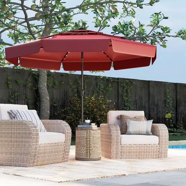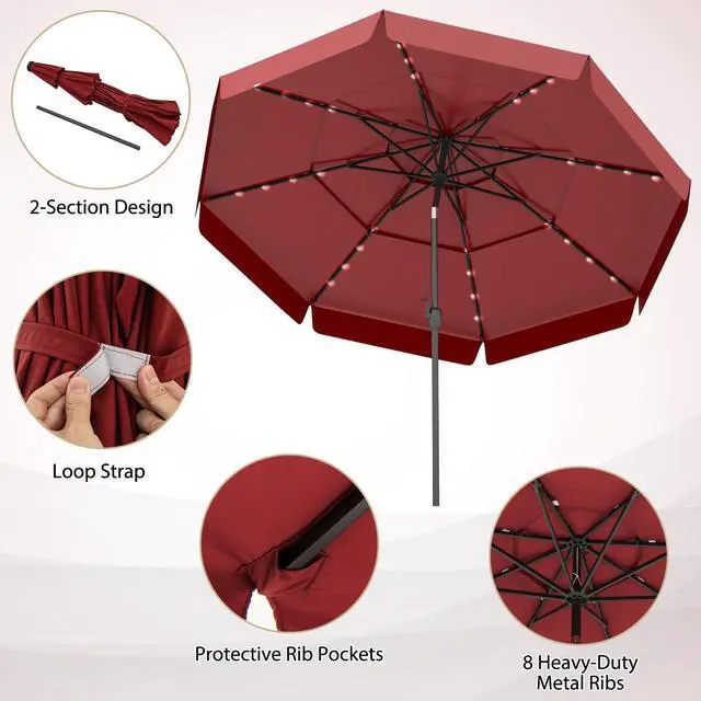 Description: Comes with a 3-tier vented top for excellent air circulation and enhanced stability8 heavy-duty metal ribs provide robust support not easy to deformCrafted from a reliable polyester canopy ensure excellent weather resistanceEquipped with ruffled edges for an elegant look and increased sunshade areaEach rib is adorned with 4 LED lights emit bright lighting enhance night ambianceThe LED lights are controlled by a handy switch on the pole easy to operateThe lights are powered by a solar panel provide 6-8 H illumination after a full chargeEasy to tilt by a push button provide customized shade based on the sun's positionEquipped with a hassle-free crank handle for simple and quick opening and closingEquipped with a convenient 2-section design for space-saving storageFeatures a convenient loop strap to secure the umbrella into a compact sizeEquipped with protective rib pockets prevent the canopy from tearing