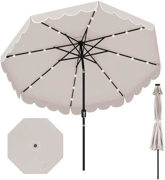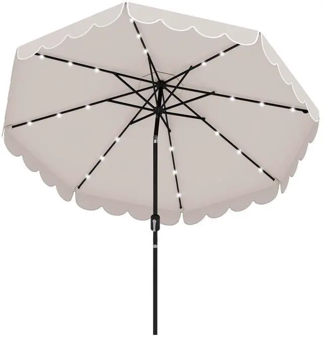 Manual Description: Adorned with 24 bright LED lights on the ribs enhance night ambianceThe LED lights are controlled by a handy switch on the pole easy to operateThe lights are powered by a solar panel provide 5 H illumination after a full chargeEasy to tilt by a push button provide customized shade based on the sun's positionFeatures a 2-section design and hassle-free crank handle easy to install and detachFeatures a convenient loop strap to secure the umbrella into a compact sizeEquipped with protective rib pockets prevent the canopy from tearingThe reliable polyester canopy offers superior sun protection and fade resistanceEquipped with ruffled edges for an elegant look and increased sunshade areaDesigned with a top air vent for air circulation and enhanced stabilityIn the daytime provide a cool shaded area for alfresco momentsAt nighttime the solar powered LED lights brighten your summer nights8 heavy-duty metal ribs ensure unparalleled stability and wind resistanceEquipped with a safety latch prevent the umbrella from accidental closing