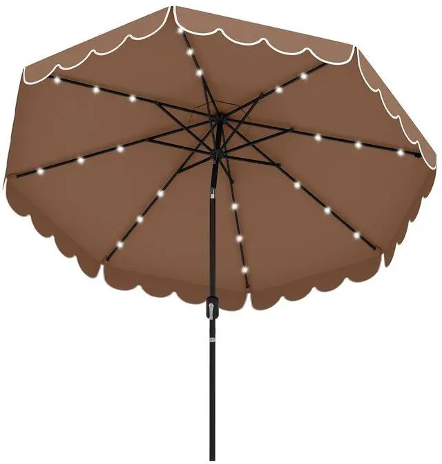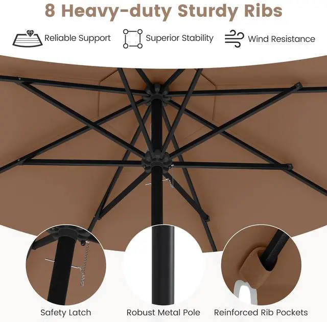 Manual Description: Adorned with 24 bright LED lights on the ribs enhance night ambianceThe LED lights are controlled by a handy switch on the pole easy to operateThe lights are powered by a solar panel provide 5 H illumination after a full chargeEasy to tilt by a push button provide customized shade based on the sun's positionFeatures a 2-section design and hassle-free crank handle easy to install and detachFeatures a convenient loop strap to secure the umbrella into a compact sizeEquipped with protective rib pockets prevent the canopy from tearingThe reliable polyester canopy offers superior sun protection and fade resistanceEquipped with ruffled edges for an elegant look and increased sunshade areaDesigned with a top air vent for air circulation and enhanced stabilityIn the daytime provide a cool shaded area for alfresco momentsAt nighttime the solar powered LED lights brighten your summer nights8 heavy-duty metal ribs ensure unparalleled stability and wind resistanceEquipped with a safety latch prevent the umbrella from accidental closing