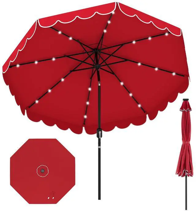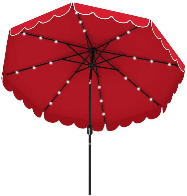 Manual Description: Adorned with 24 bright LED lights on the ribs enhance night ambianceThe LED lights are controlled by a handy switch on the pole easy to operateThe lights are powered by a solar panel provide 5 H illumination after a full chargeEasy to tilt by a push button provide customized shade based on the sun's positionFeatures a 2-section design and hassle-free crank handle easy to install and detachFeatures a convenient loop strap to secure the umbrella into a compact sizeEquipped with protective rib pockets prevent the canopy from tearingThe reliable polyester canopy offers superior sun protection and fade resistanceEquipped with ruffled edges for an elegant look and increased sunshade areaDesigned with a top air vent for air circulation and enhanced stabilityIn the daytime provide a cool shaded area for alfresco momentsAt nighttime the solar powered LED lights brighten your summer nights8 heavy-duty metal ribs ensure unparalleled stability and wind resistanceEquipped with a safety latch prevent the umbrella from accidental closing
