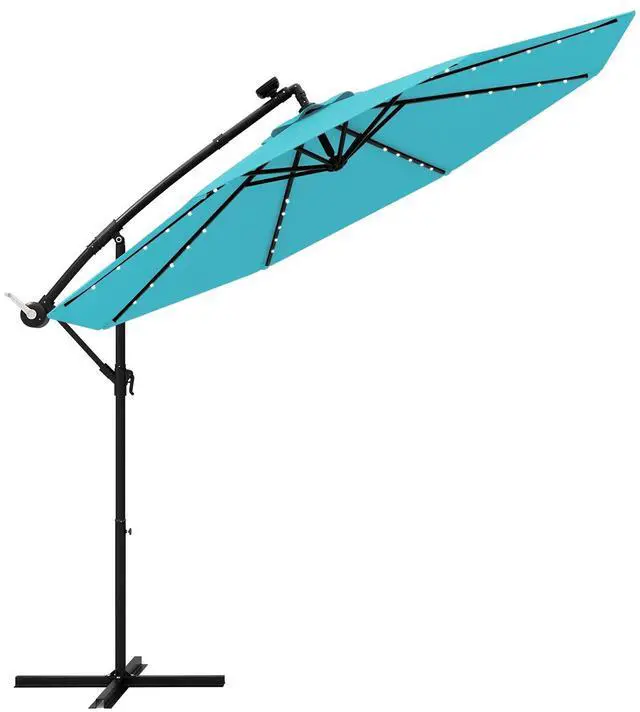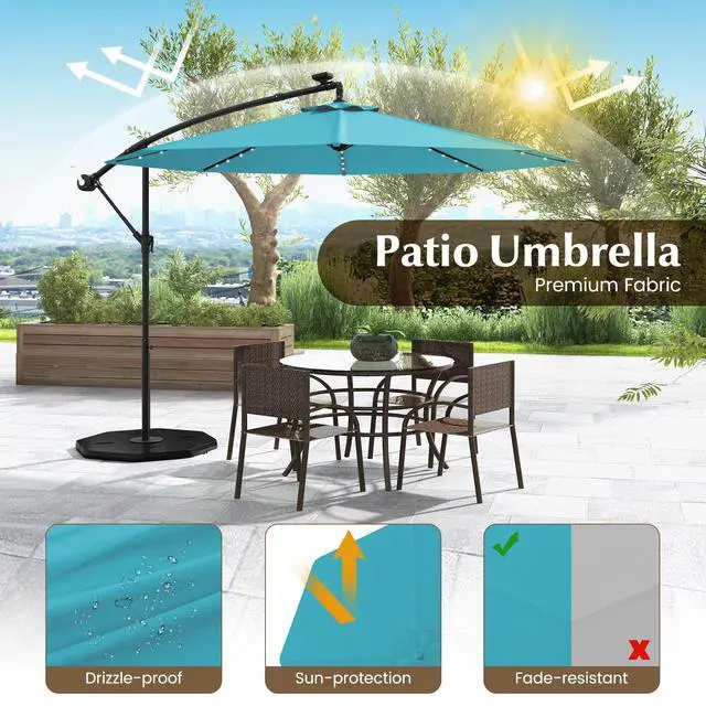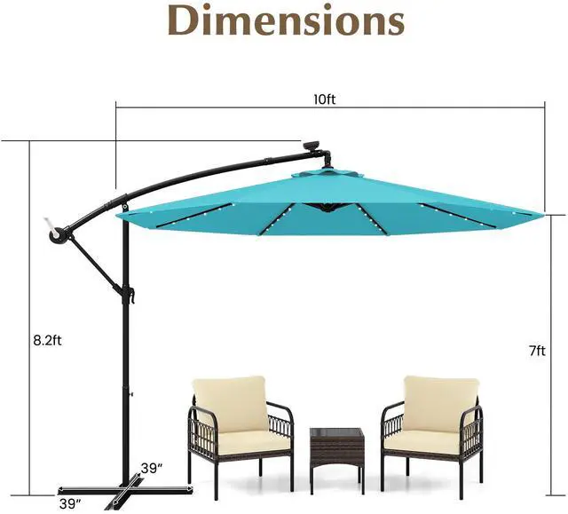 Instruction Description: Comes with 40 lamp beads and each rib features 5 provide beautiful lightingThe solar panel provides illumination for up to 7 hours when fully chargedWith its large shading area create a cool and comfortable outdoor retreatThe adjustable tilt function allows you to easily customize the shade angle from 0-35°Easy to tilt: loosen the locking handle and then move the handle up and downMade of high-quality polyester fabric fade-resistant wear and tear-resistant durableDesigned with a vented top for air circulation and stability even on windy daysDesigned with a convenient crank handle for easy opening and closingThe loop strap provides a secure fastening option when the umbrella is not in use8 heavy-duty metal ribs ensure unparalleled stability and sturdinessFeatures reinforced rib pockets help resist tearing or rib damageThe thick metal pole is rustproof and can withstand outdoor bad elementsPackage includeing 1 Offset Umbrella 1 Cross Base 1 Instruction