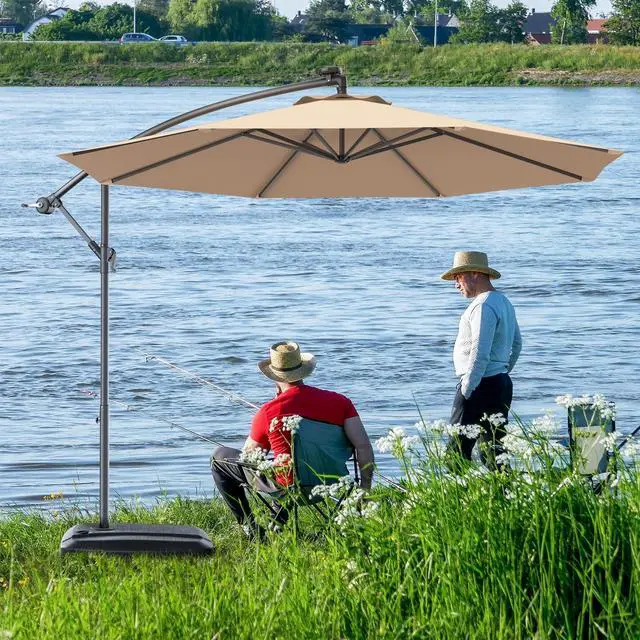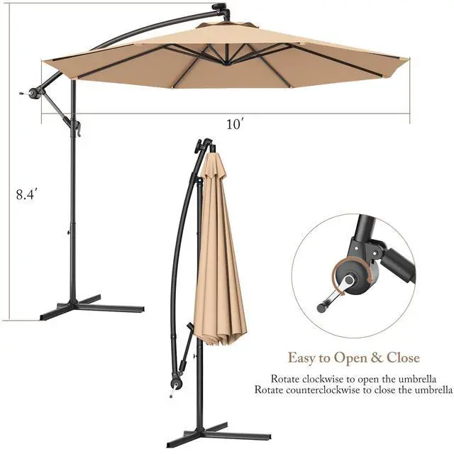 Description: This 10' patio outdoor sunshade is perfect for decorating the areas around your house to beautify your surrounding environment. This hanging offset umbrella sun tent rain shelter and more all in one the parasol gives you instant portable protection from the elements regardless of your activity. The beach umbrella sets up in just three seconds. As a result you don't have to deal with finicky stakes or willowy tarps should a rainstorm roll in without notice. Just pop open the umbrella and ground stakes for extra stability. If you are looking for an hanging offset umbrella don't hesitate to place the order!. Brand new and high quality Hanging umbrella with crank Tilt for more desired angles of shading Steel ribs and pole Frame with black powder coating finish Easy tilt operation hand-crank lift Ideal for commercial and residential use Stable for a beach umbrella sun tent rain shelter Steel pole with tilt and crank Large octagonal shape measures with air vent UV protective and water repellant Easy-to-operate We suggest you to not leave the umbrella open in windy conditions 8 firm steel ribs construction support the canopy stably Heavy duty steel cross base for stability