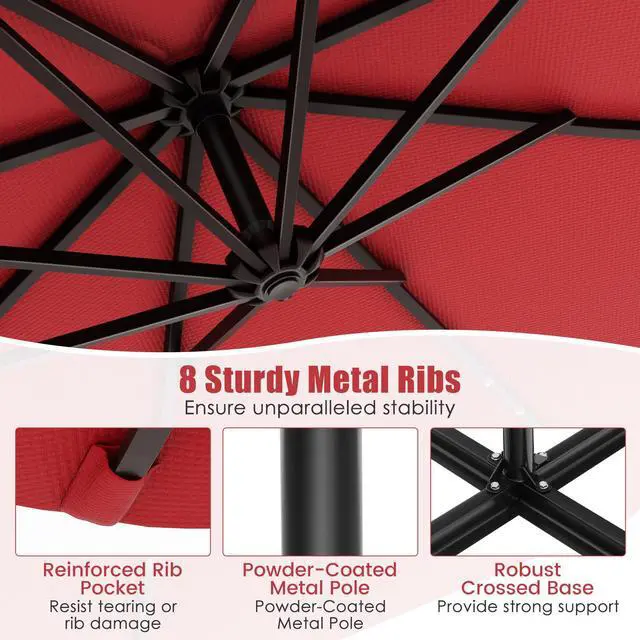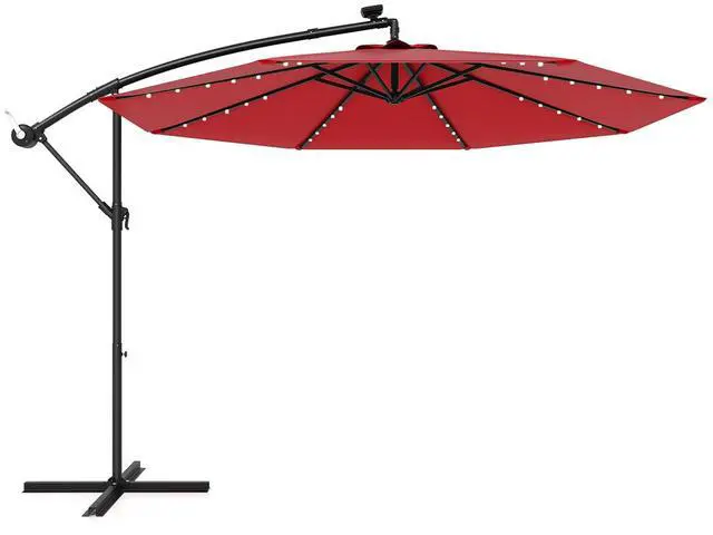 Instruction Description: Comes with 40 lamp beads and each rib features 5 provide beautiful lightingThe solar panel provides illumination for up to 7 hours when fully chargedWith its large shading area create a cool and comfortable outdoor retreatThe adjustable tilt function allows you to easily customize the shade angle from 0-35°Easy to tilt: loosen the locking handle and then move the handle up and downMade of high-quality polyester fabric fade-resistant wear and tear-resistant durableDesigned with a vented top for air circulation and stability even on windy daysDesigned with a convenient crank handle for easy opening and closingThe loop strap provides a secure fastening option when the umbrella is not in use8 heavy-duty metal ribs ensure unparalleled stability and sturdinessFeatures reinforced rib pockets help resist tearing or rib damageThe thick metal pole is rustproof and can withstand outdoor bad elementsPackage includeing 1 Offset Umbrella 1 Cross Base 1 Instruction
