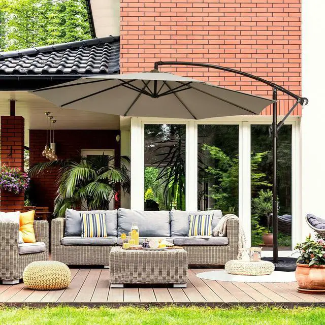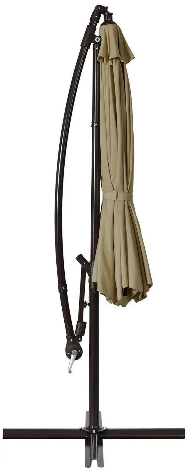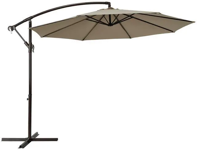 Description: This 10' patio outdoor sunshade is perfect for decorating the areas around your house to beautify your surrounding environment. This hanging offset umbrella sun tent rain shelter and more all in one the parasol gives you instant portable protection from the elements regardless of your activity. The beach umbrella sets up in just three seconds. As a result you don't have to deal with finicky stakes or willowy tarps should a rainstorm roll in without notice. Just pop open the umbrella and ground stakes for extra stability. If you are looking for an hanging offset umbrella don't hesitate to place the order!. Brand new and high quality Hanging umbrella with crank Tilt for more desired angles of shading Steel ribs and pole Frame with black powder coating finish Easy tilt operation hand-crank lift Ideal for commercial and residential use Stable for a beach umbrella sun tent rain shelter Steel pole with tilt and crank Large octagonal shape measures with air vent UV protective and water repellant Easy-to-operate We suggest you to not leave the umbrella open in windy conditions 8 firm steel ribs construction support the canopy stably Heavy duty steel cross base for stability