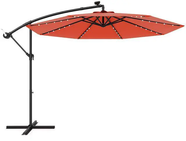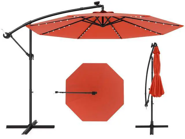 Instruction Description: Comes with 40 lamp beads and each rib features 5 provide beautiful lightingThe solar panel provides illumination for up to 7 hours when fully chargedWith its large shading area create a cool and comfortable outdoor retreatThe adjustable tilt function allows you to easily customize the shade angle from 0-35°Easy to tilt: loosen the locking handle and then move the handle up and downMade of high-quality polyester fabric fade-resistant wear and tear-resistant durableDesigned with a vented top for air circulation and stability even on windy daysDesigned with a convenient crank handle for easy opening and closingThe loop strap provides a secure fastening option when the umbrella is not in use8 heavy-duty metal ribs ensure unparalleled stability and sturdinessFeatures reinforced rib pockets help resist tearing or rib damageThe thick metal pole is rustproof and can withstand outdoor bad elementsPackage includeing 1 Offset Umbrella 1 Cross Base 1 Instruction