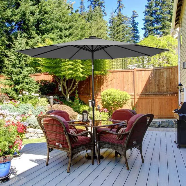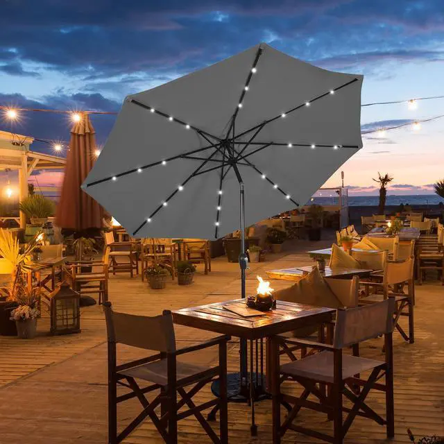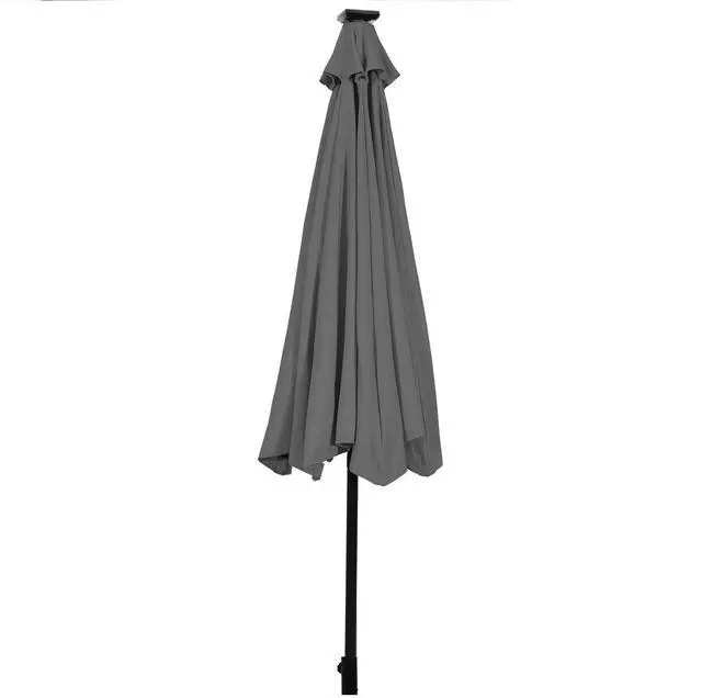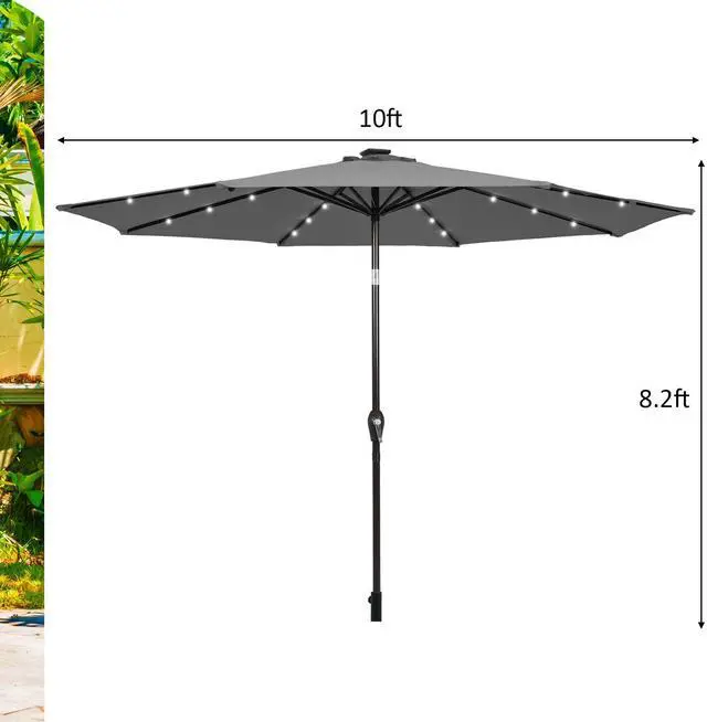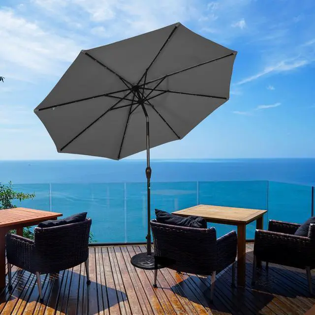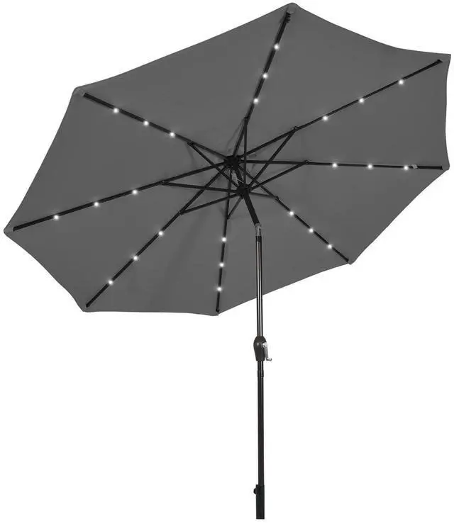 Description: With 24 solar-powered LED lights to light up the nightHandy crank lift makes it easy to open or close the patio umbrellaInnovative push-button tilt mechanism for shade in all directions 1.5" diameter pole and 8 sturdy ribs for a powerful supportMade of premium polyester fabric to block away scorching sunlightVented canopy for better air circulation and wind resistanceSewn-in hook and loop fastener straps to easily wrap around the closed umbrellaIdeal for residential commercial locations and any outdoor places